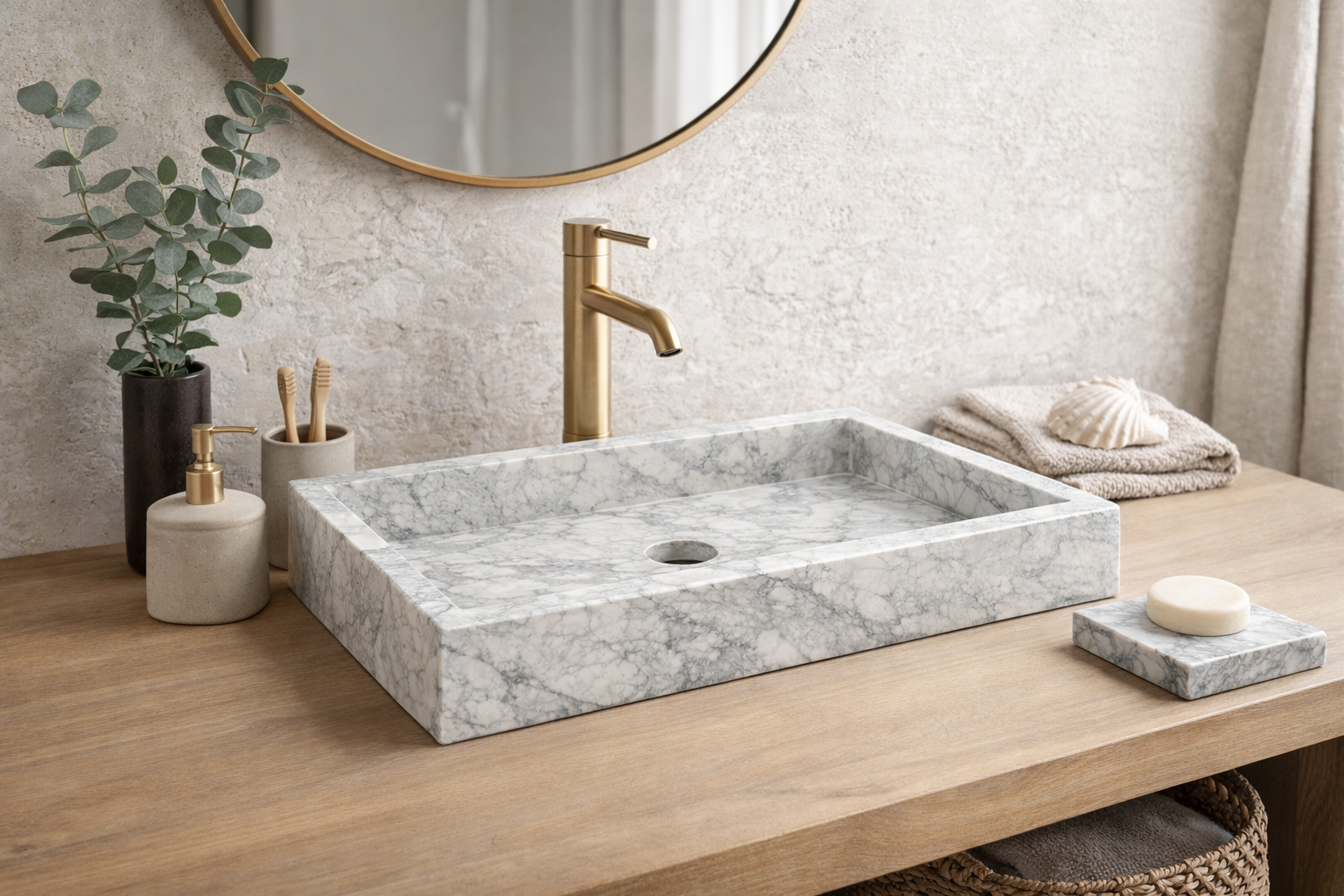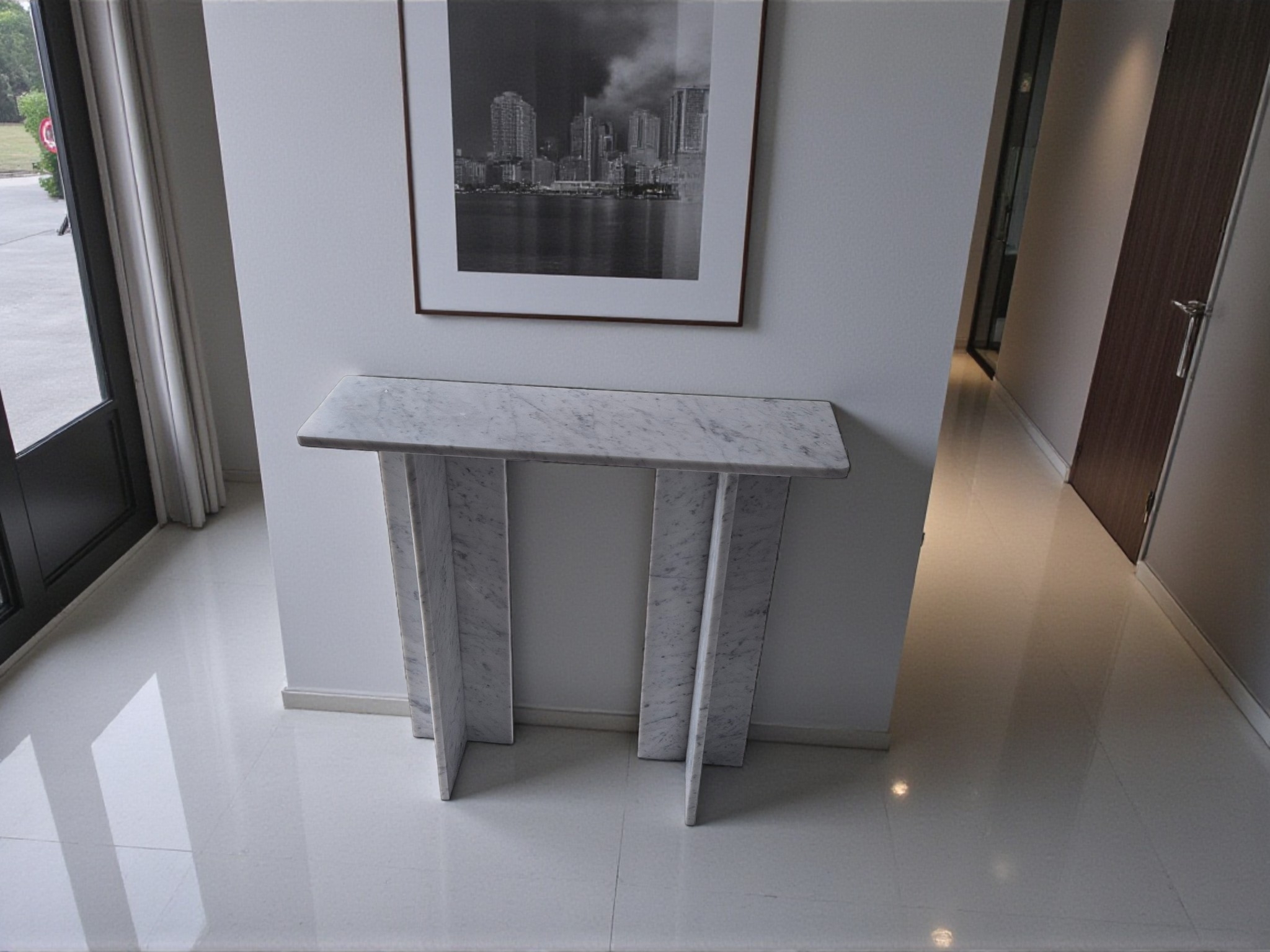 Konsole, doniczki, umywalki, szafki nocne oraz inne detale z marmuru Bianco Carrara stanowią eleganckie uzupełnienie wnętrza, nadając mu ekskluzywny i spójny charakter.
