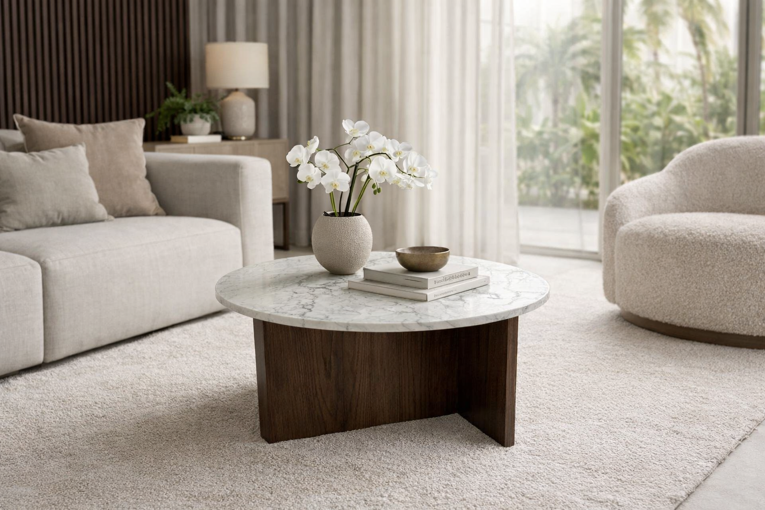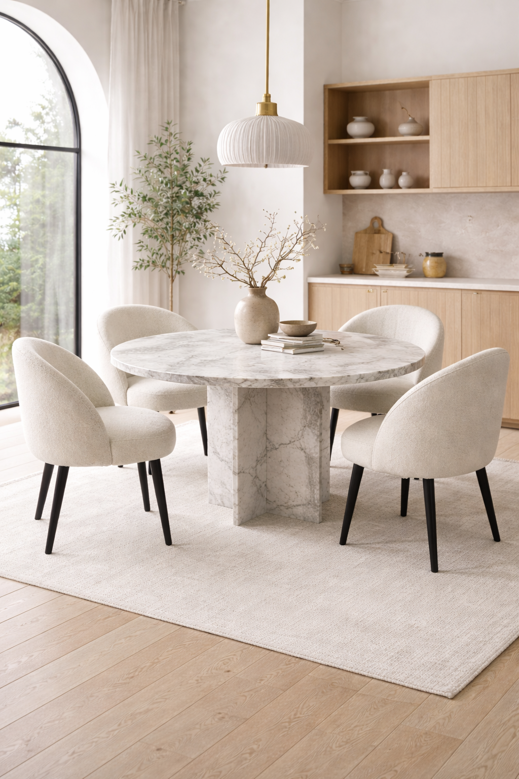 Masywne stoły oraz stoliki wykonane z marmuru stanowią wyrazisty, rzeźbiarski element aranżacji. Każdy egzemplarz jest unikatowy dzięki niepowtarzalnemu użyleniu i naturalnej strukturze kamienia.