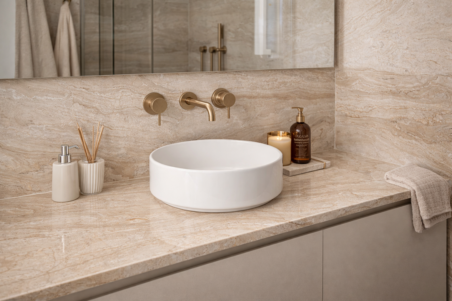 Marmur Daino Reale jest chętnie wybierany na blaty łazienkowe ze względu na estetyczny wygląd i szlachetny charakter. Odpowiednio zaimpregnowany tworzy elegancką i funkcjonalną powierzchnię.