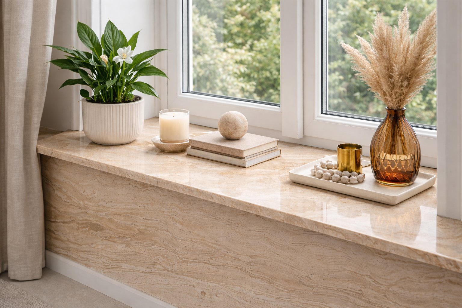 Daino Reale doskonale sprawdza się jako parapet wewnętrzny, wprowadzając do wnętrza ciepło i elegancję naturalnego kamienia. Subtelne użylenie i beżowa kolorystyka harmonijnie komponują się z różnymi stylami aranżacji.
