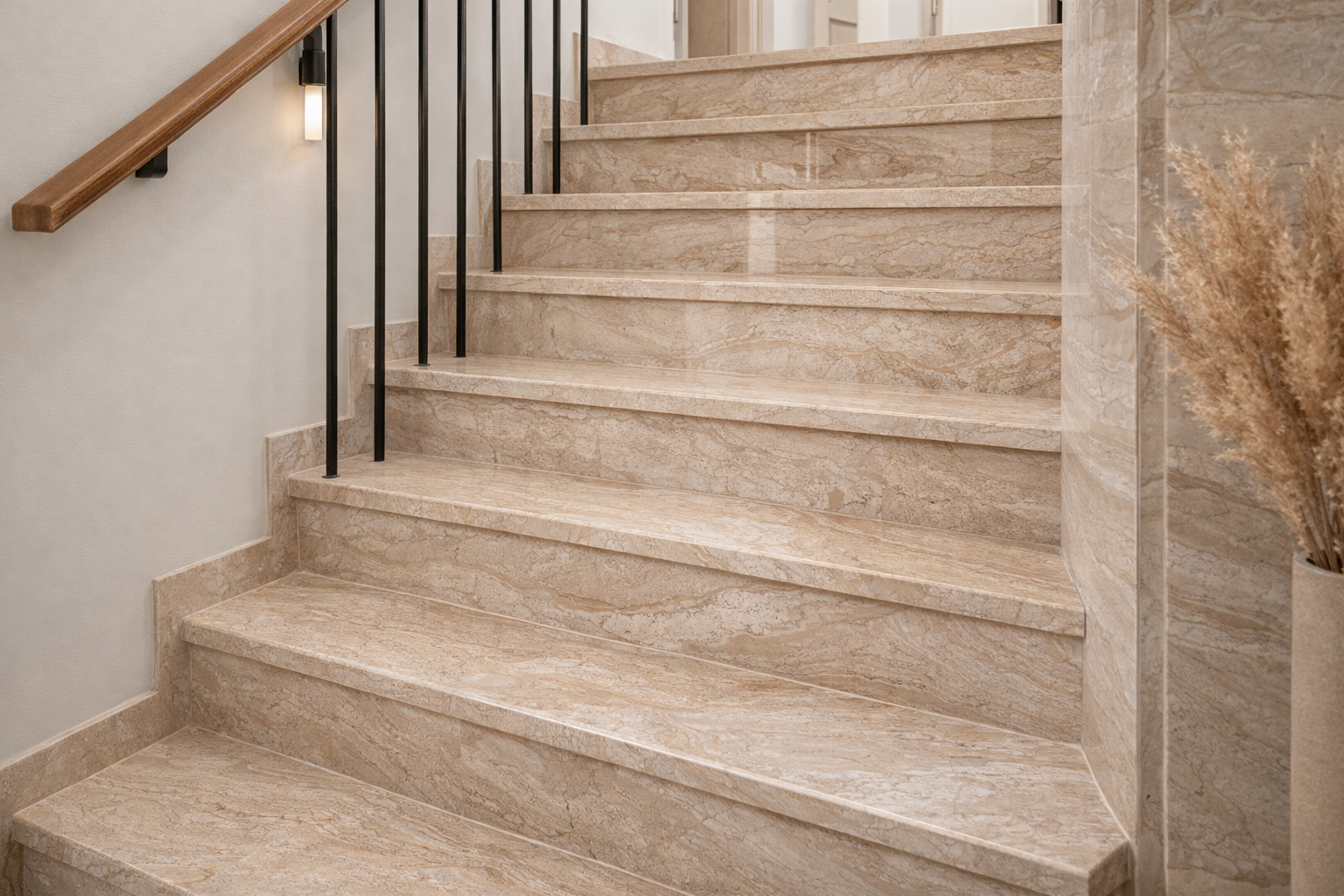 Marmur Daino Reale doskonale sprawdza się na stopniach schodów wewnętrznych, nadając przestrzeni elegancki i spójny wygląd. Ciepła, beżowa kolorystyka oraz naturalne użylenie podkreślają reprezentacyjny charakter wnętrza, a odpowiednia obróbka powierzchni zapewnia komfort i bezpieczeństwo użytkowania.