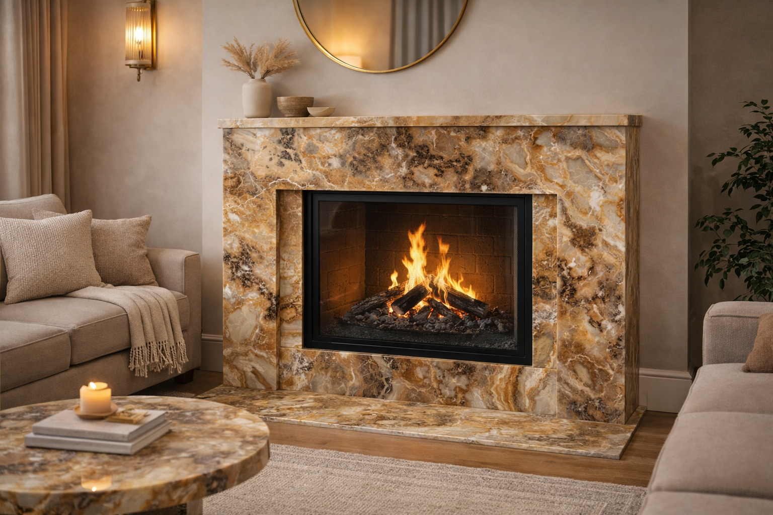 Kamień ten świetnie sprawdza się w formie obudowy kominków, wnęk ściennych czy paneli dekoracyjnych. Stosowany punktowo podkreśla wybrane strefy aranżacji i dodaje przestrzeni elegancji oraz głębi.