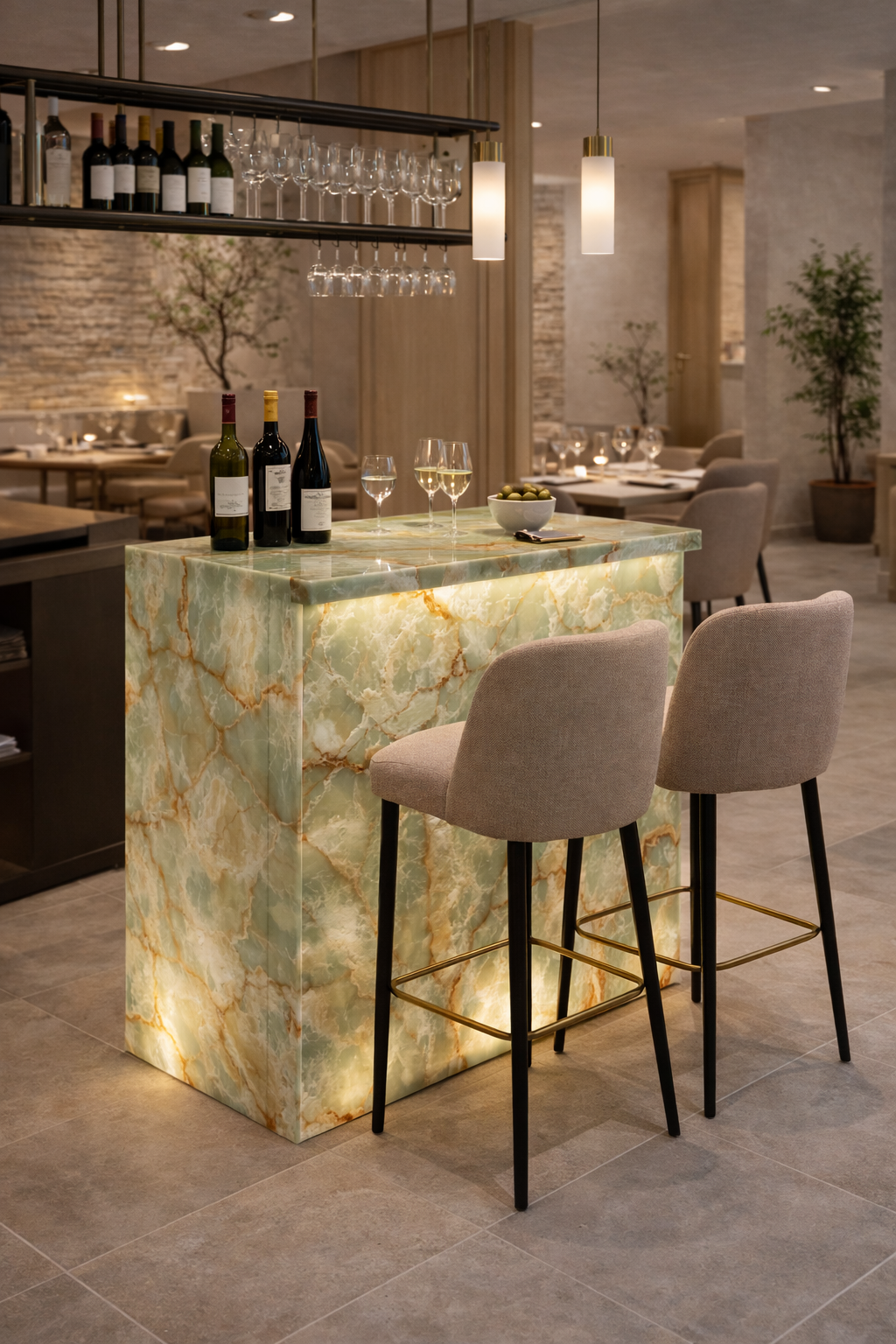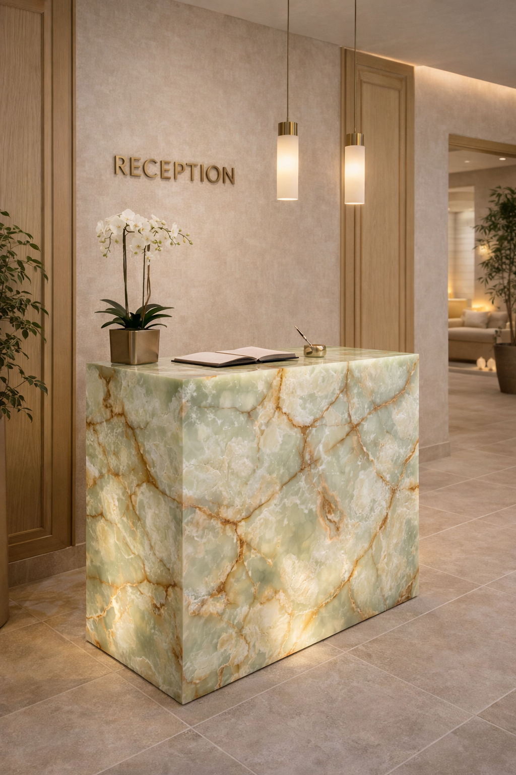 Onyx jest często wykorzystywany w przestrzeniach reprezentacyjnych – na frontach lad recepcyjnych i barach hotelowych. Podświetlona powierzchnia staje się centralnym punktem wnętrza, budując prestiż i przyciągając uwagę gości.