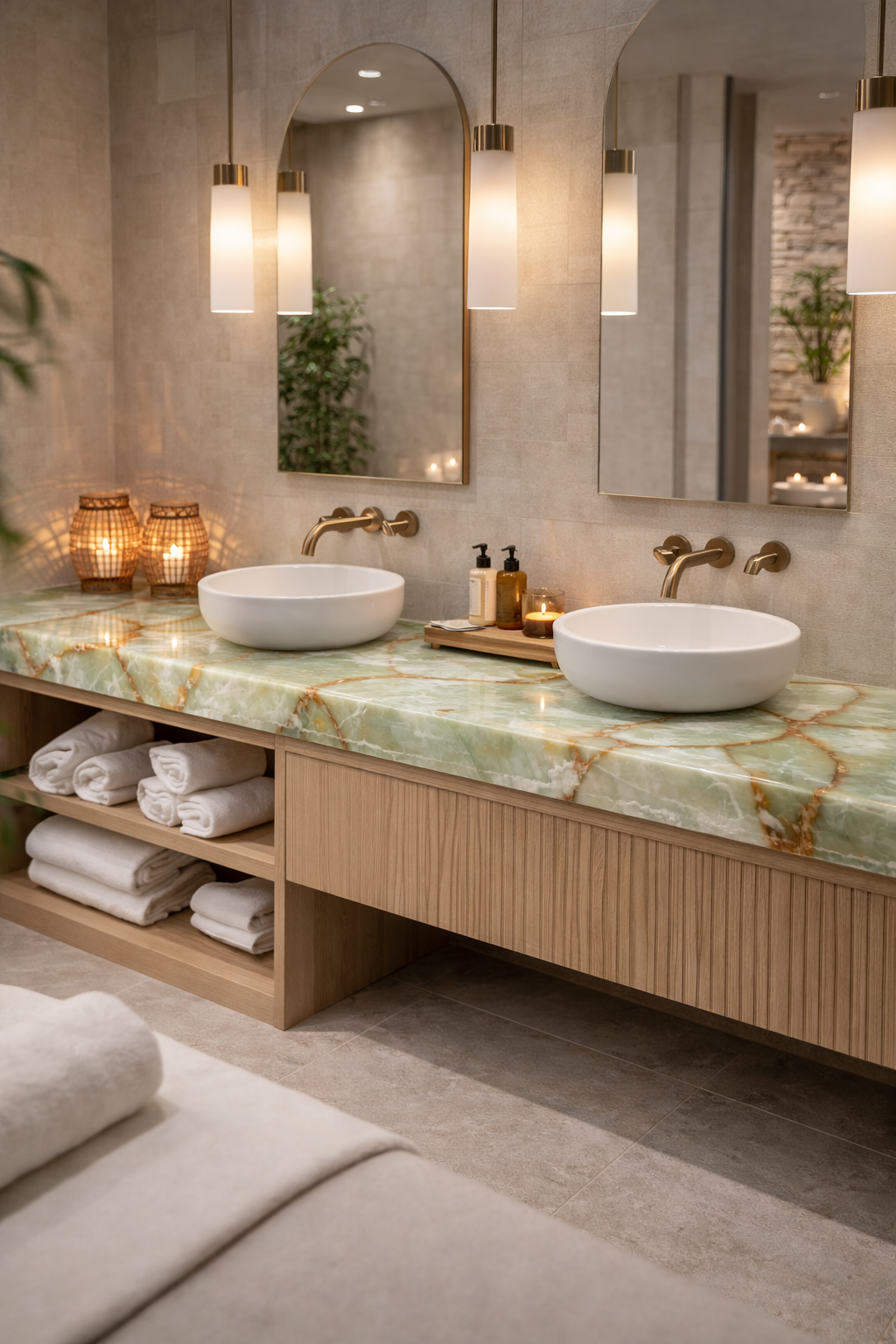 Onyx doskonale sprawdza się jako blat łazienkowy, nadając wnętrzu luksusowy i elegancki charakter. Jego naturalne użylenie oraz możliwość podświetlenia podkreślają prestiż aranżacji i tworzą efekt ekskluzywnej strefy SPA.