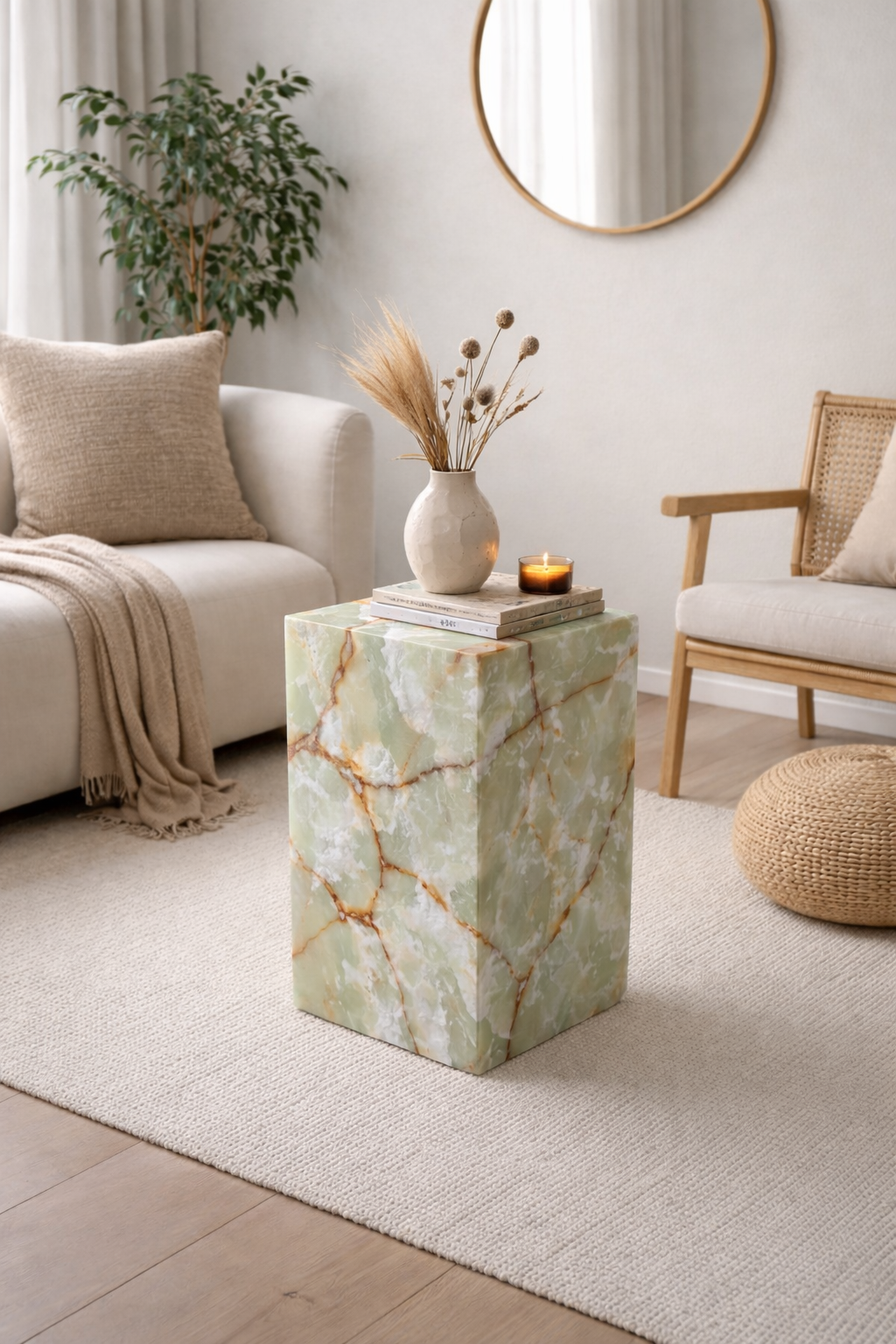 Onyx Verde to kamień dekoracyjny o półtransparentnej strukturze i wyrazistej zielonej kolorystyce, dlatego wymaga delikatnej i regularnej pielęgnacji. Odpowiednie zabezpieczenie pozwala zachować jego głębię koloru oraz naturalny połysk przez długie lata.