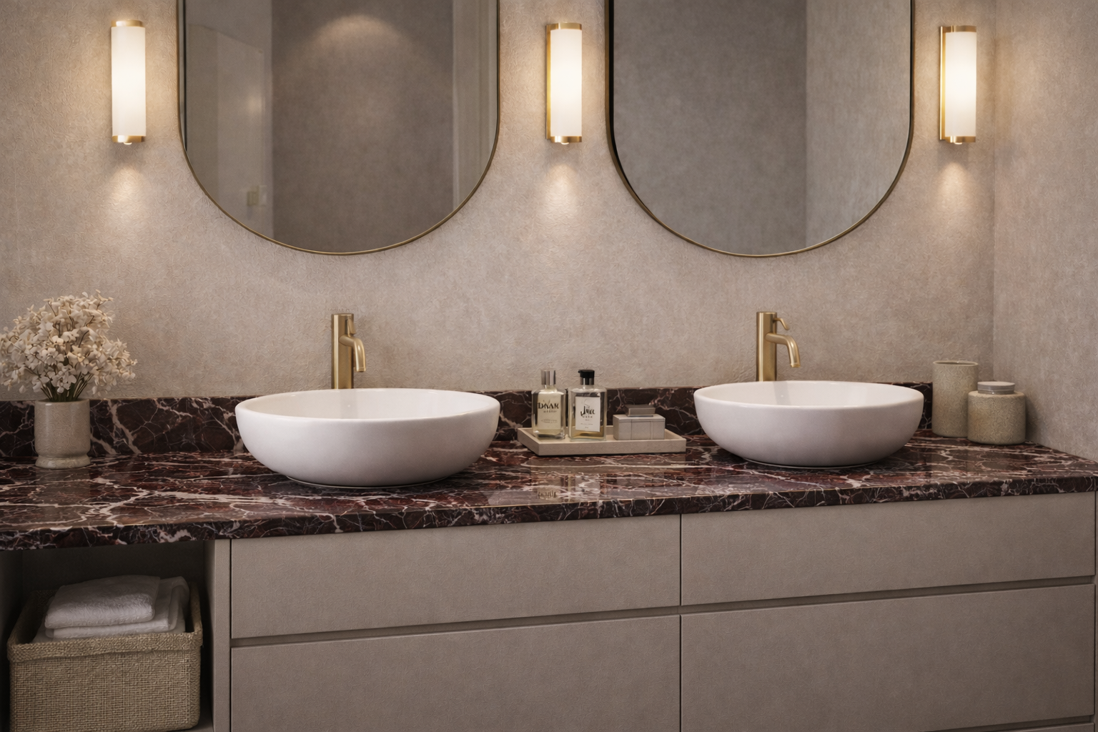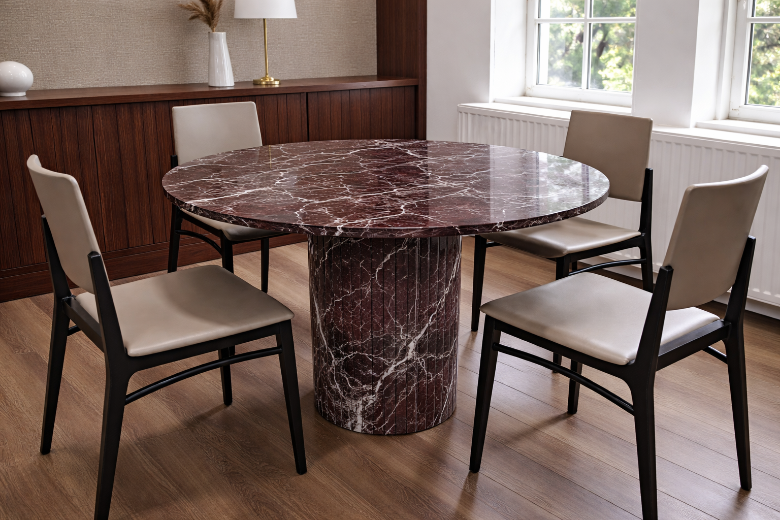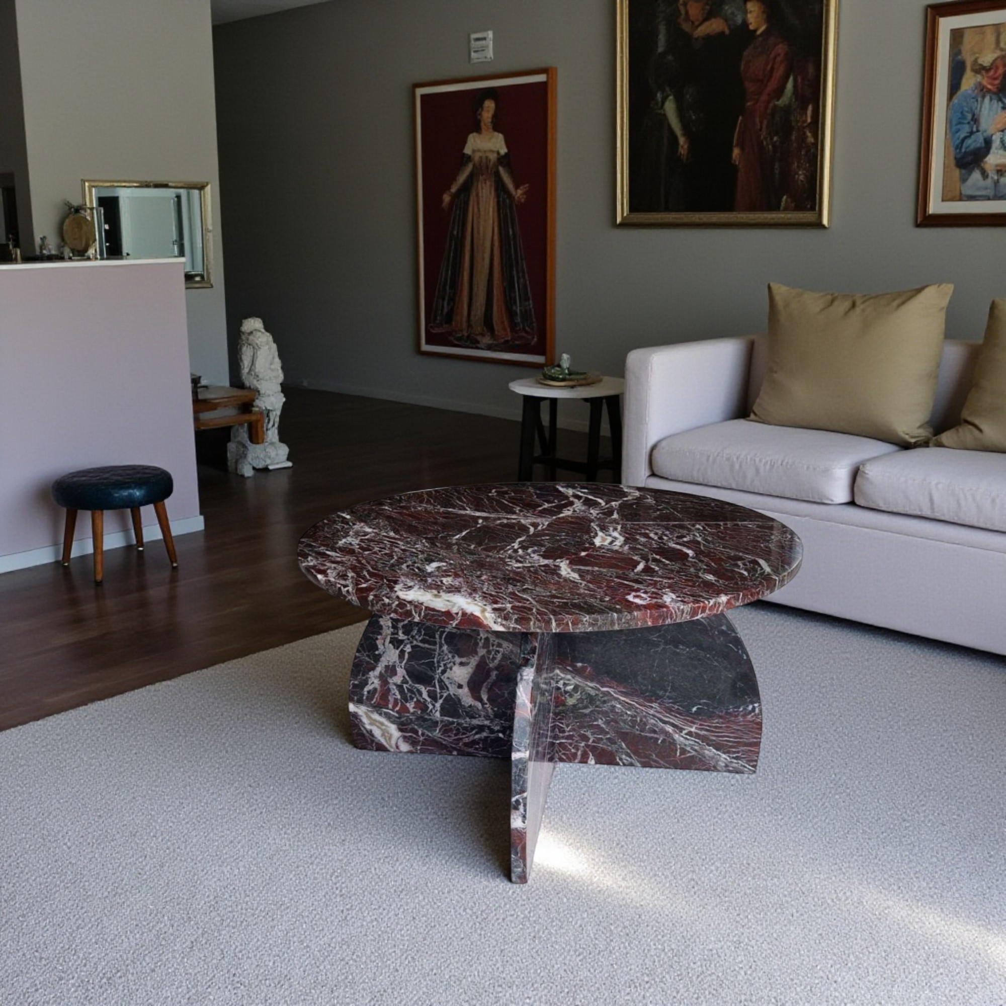 Meble wykonane z Rosso Levanto stają się rzeźbiarskim, przyciągającym wzrok elementem przestrzeni.