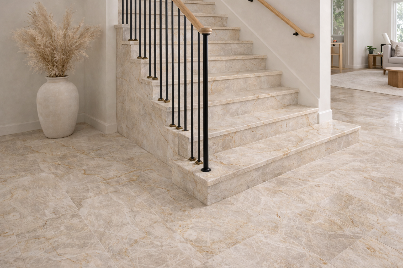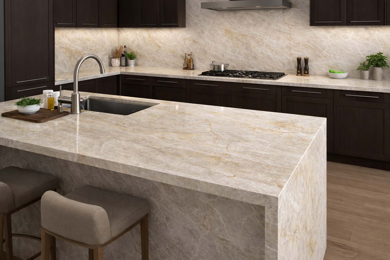 To naturalny kamień pochodzący najczęściej z Brazylii, ceniony za jasną, kremowo-beżową kolorystykę i subtelne złote użylenie. Łączy elegancję marmuru z wysoką twardością charakterystyczną dla kwarcytu.